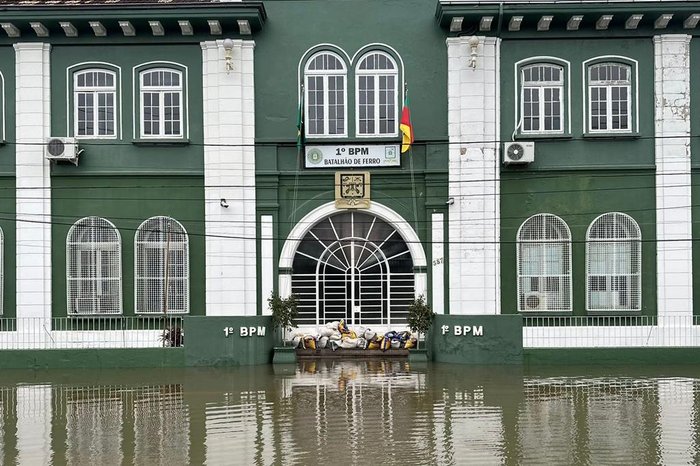 Na Avenida Pernambuco, no bairro Navegantes, em Porto Alegre, a sede da Secretaria da Segurança Pública (SSP) do Estado precisou ser evacuada, em maio. A água barrenta tomou as ruas, passou pela escadaria, invadiu o térreo, e fez submergir a recepção. Ainda na Zona Norte, no Departamento Estadual de Investigações Criminais (Deic) da Polícia Civil, a inundação chegou a quase dois metros de altura. No Menino Deus, o histórico 1° Batalhão de Polícia Militar, da BM, também ficou tomado pelas águas.