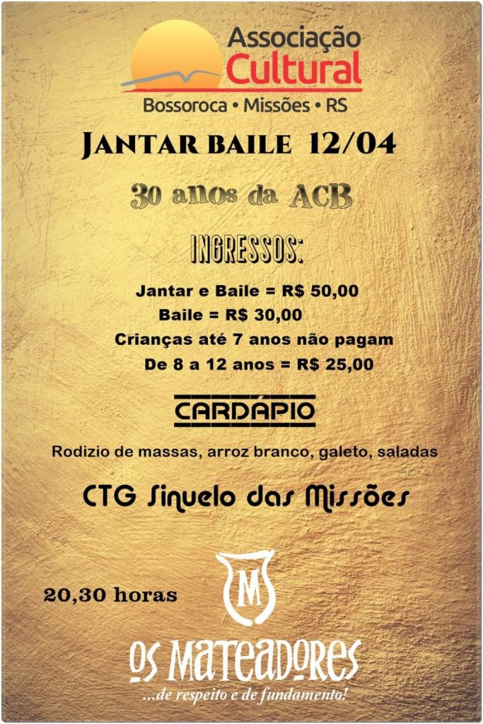 A ACB tem contribuído com o desenvolvimento cultural do município de Bossoroca, que é referência cultural para as Missões. E neste ano para marcar os 30 anos de história a entidade estará promovendo um Jantar Baile no dia 12 de abril, no CTG Sinuelo das Missões com horário de início marcado para às 20h30. O Baile será animado pelo renomado Grupo os Mateadores e os ingressos podem ser adquiridos com os membros da ACB. O cardápio será rodízio de massas, arroz, galeto e saladas.