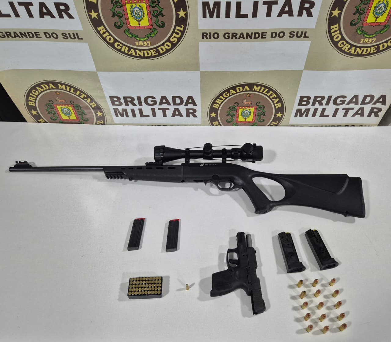 Na noite de domingo (05/04), a guarnição foi solicitada pelas vitimas que relataram terem sido ameaçadas pelo autor e que ele possuía armas e munições na residência. A guarnição deslocou ao endereço e deu voz de prisão ao autor, bem como apreendeu as armad e as munições, sendo todas as partes encaminhadas a Delegacia de Policia para registro.