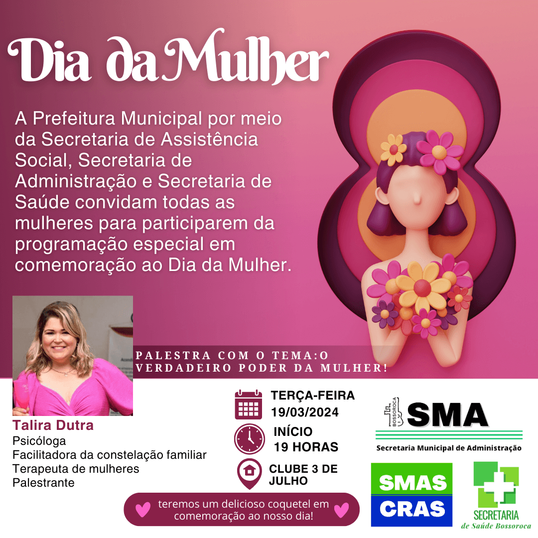 A Administração Municipal através da Secretaria de Saúde, Secretaria de Assistência Social e Secretaria de Administração irão realizar um evento em comemoração ao dia da mulher, e você é nossa convidada especial!