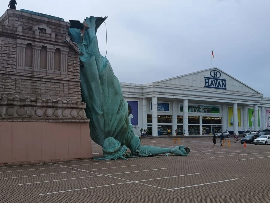 Réplica da Estátua da Liberdade da loja Havan cai durante temporal em Guaíba