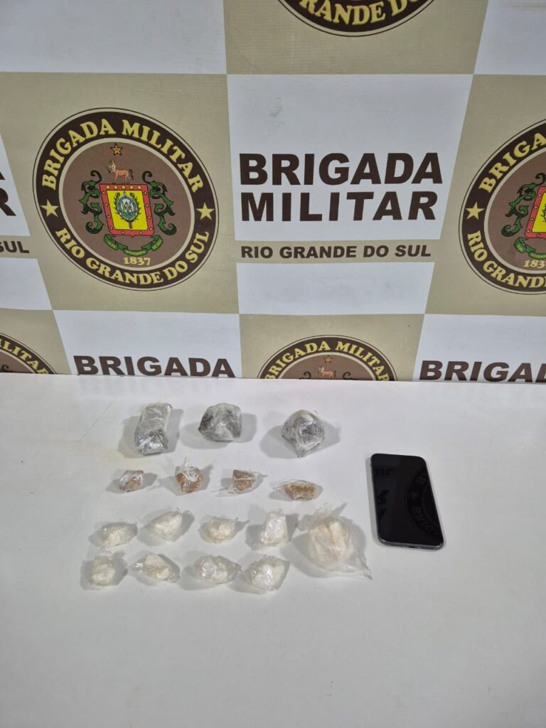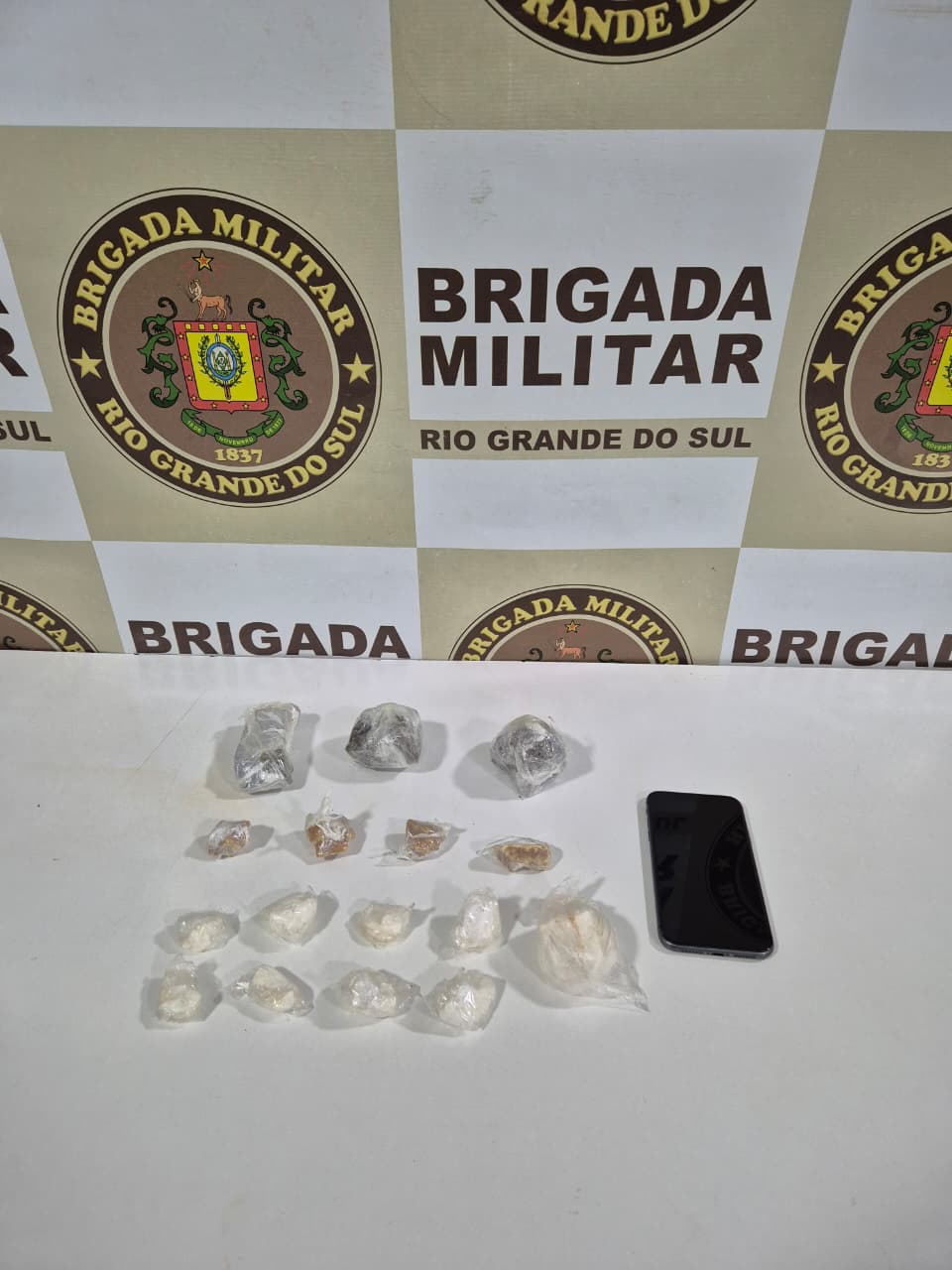Durante patrulhamento tático motorizado a equipe visualizou um veículo Kadett o qual sinalizava que dobraria o cruzamento para direita, momento em que a equipe ao se aproximar do cruzamento o veículo seguiu reto pela Rua Silva Jardim, aumentando a velocidade e dobrando na próxima rua. Foi realizada abordagem e localizada uma sacola de mercado branca nos pés do caroneiro onde foi localizada a quantia de 04 (quatro) porções de crack, 09 (nove) porções de cocaína e 03 (três) porções de maconha. Perguntado informalmente o menor informou que pegou uma carona e que não tinha conhecimento do que havia na sacola. Ambos foram conduzidos à DPPA para os procedimentos de praxe.